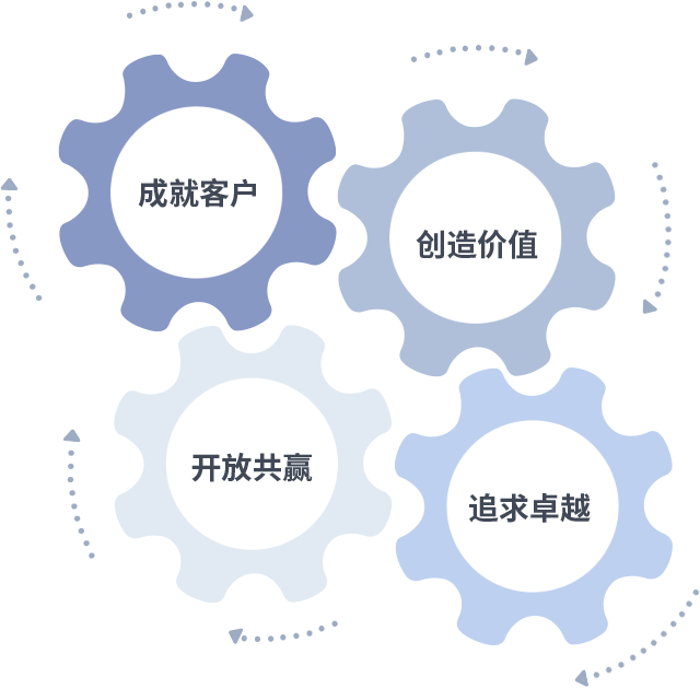 成就客户是一切决策的出发点,,创造价值是衡量所有工作的标准,,,追求卓越是我们做事做人的态度,,,开放共赢是我们的格局也是最终的结果。。。价值观的齿轮环环相扣,,,,推动着组织里的每个人不断向前。。